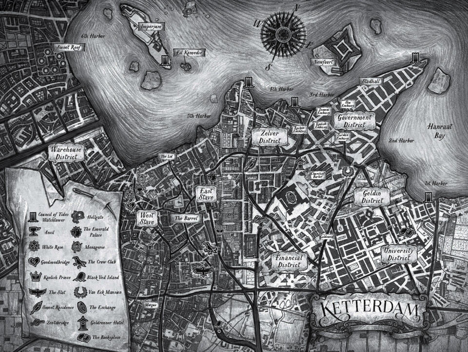 THE BARREL is the entertainment and pleasure district of Ketterdam and it's bracketed by two major canals; EAST STAVE and WEST STAVE. Unlike in the rest of the city, buildings on the staves are bigger, wider, and painted in garish colors in an attempt to capture the attention from passersby. The Barrel is noisy, chaotic, and crowded with people; it smells of rotting vegetable stink, old urine, clams, and wet stone.The area between the staves is a tangle of narrow streets, minor waterways, and tilting buildings. Most of the buildings in the Barrel were built without foundations, on swampy land where the canals were haphazardly dug. These buildings are often falling apart—cold and damp, with plaster sliding from the walls and gaps in the windows wide enough to let in rain and snow. They have gabled peaks and off-kilter chimneys. Sometimes the fireplaces are too clogged with debris to function.